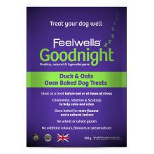 Oven baked with Duck & Oats with chamomile, valerian & scullcap. ingredients known for their relaxing and calming qualities. Ideal at times of stress or before bed. No artificial colours, flavours or preservatives. No wheat or wheat gluten. Rice free