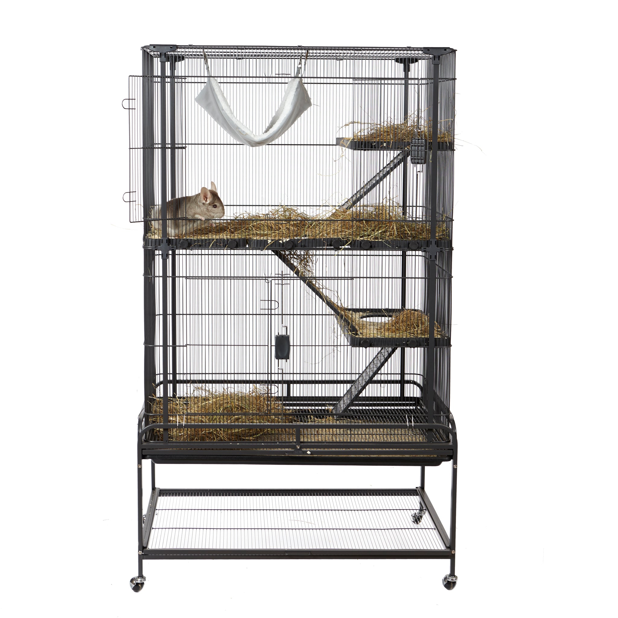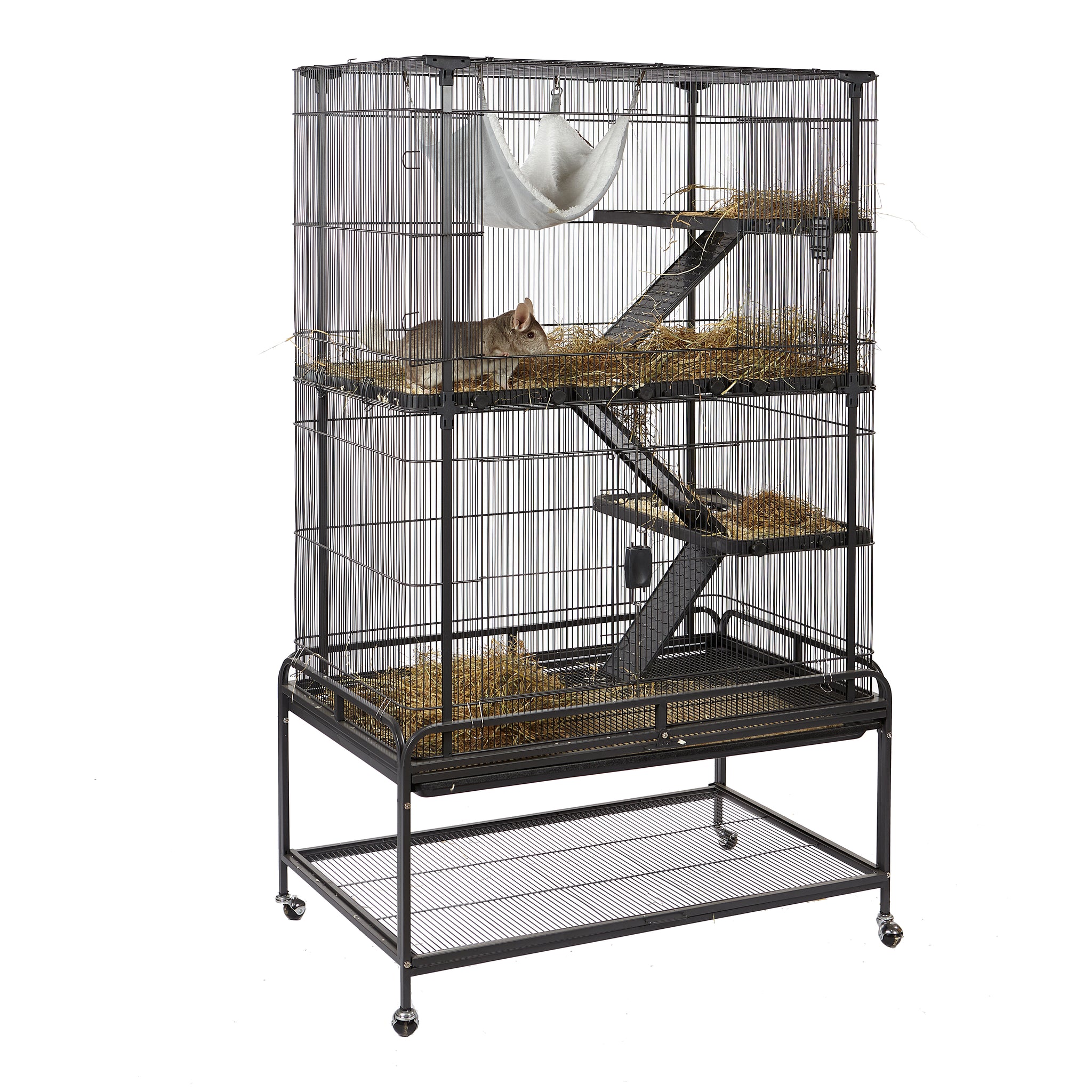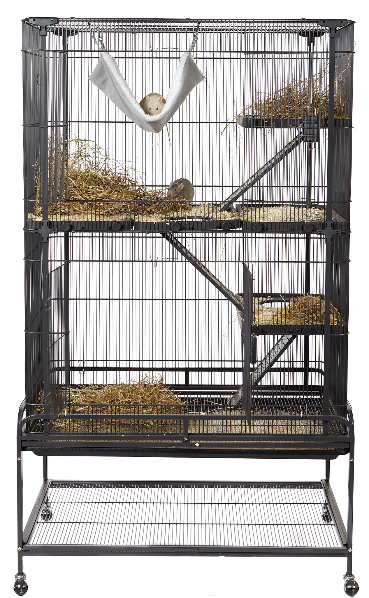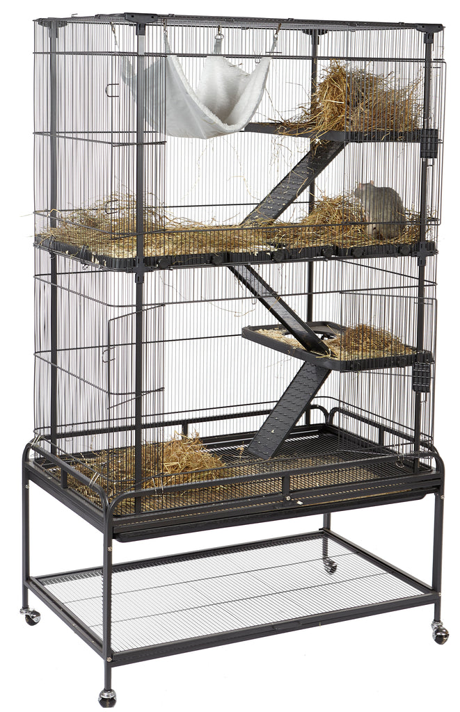 The Trekker cage features a Pull out lower tray and grill. 2 large front doors with 4 levels and 3 ladders. Hammock included.