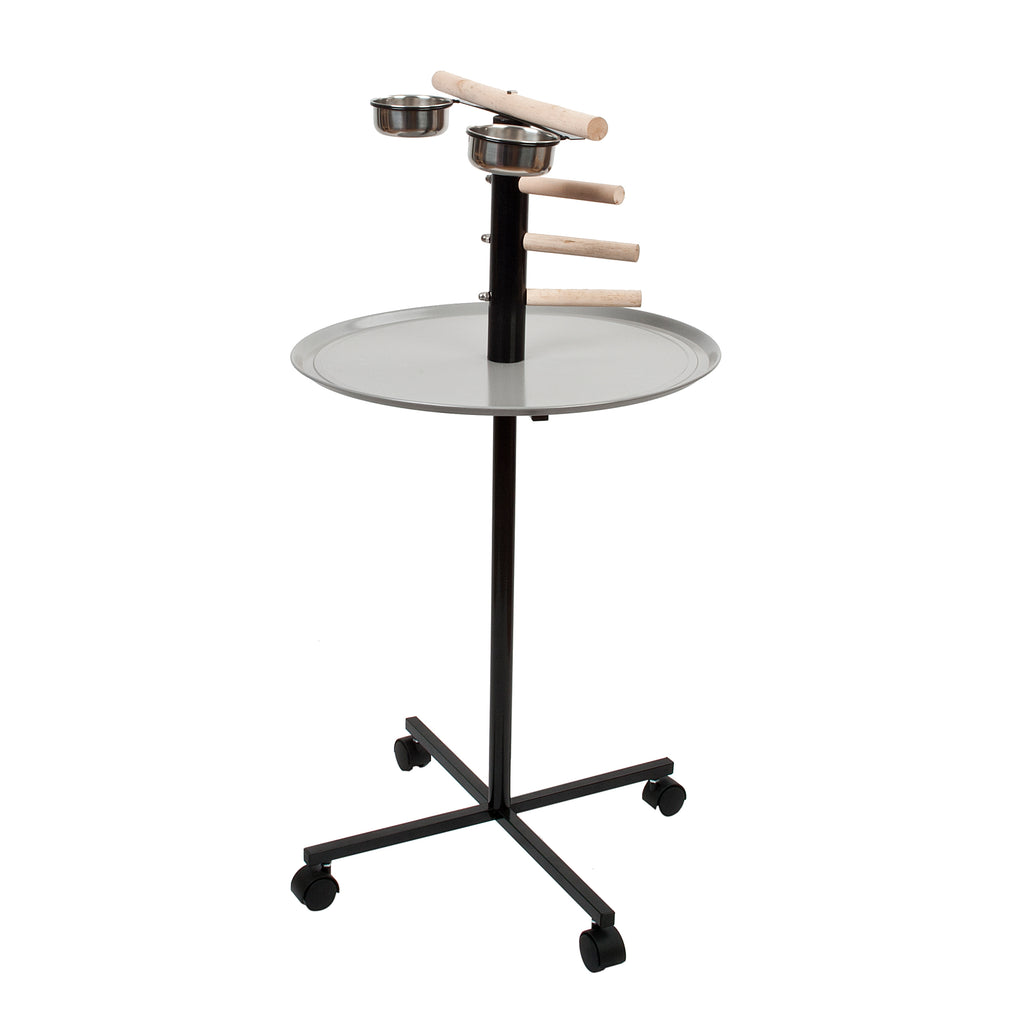 The Rainforest Cages T-Bar Stand play stand is suitable for Small Parrots, e.g. Senegals, Medium Parrots, e.g. African Greys and other similar sized birds. The T-Bar Stand play stand features castors and a tray to catch seeds. The T-Bar Stand play stand includes four wooden perches and two stainless steel feeding bowls.